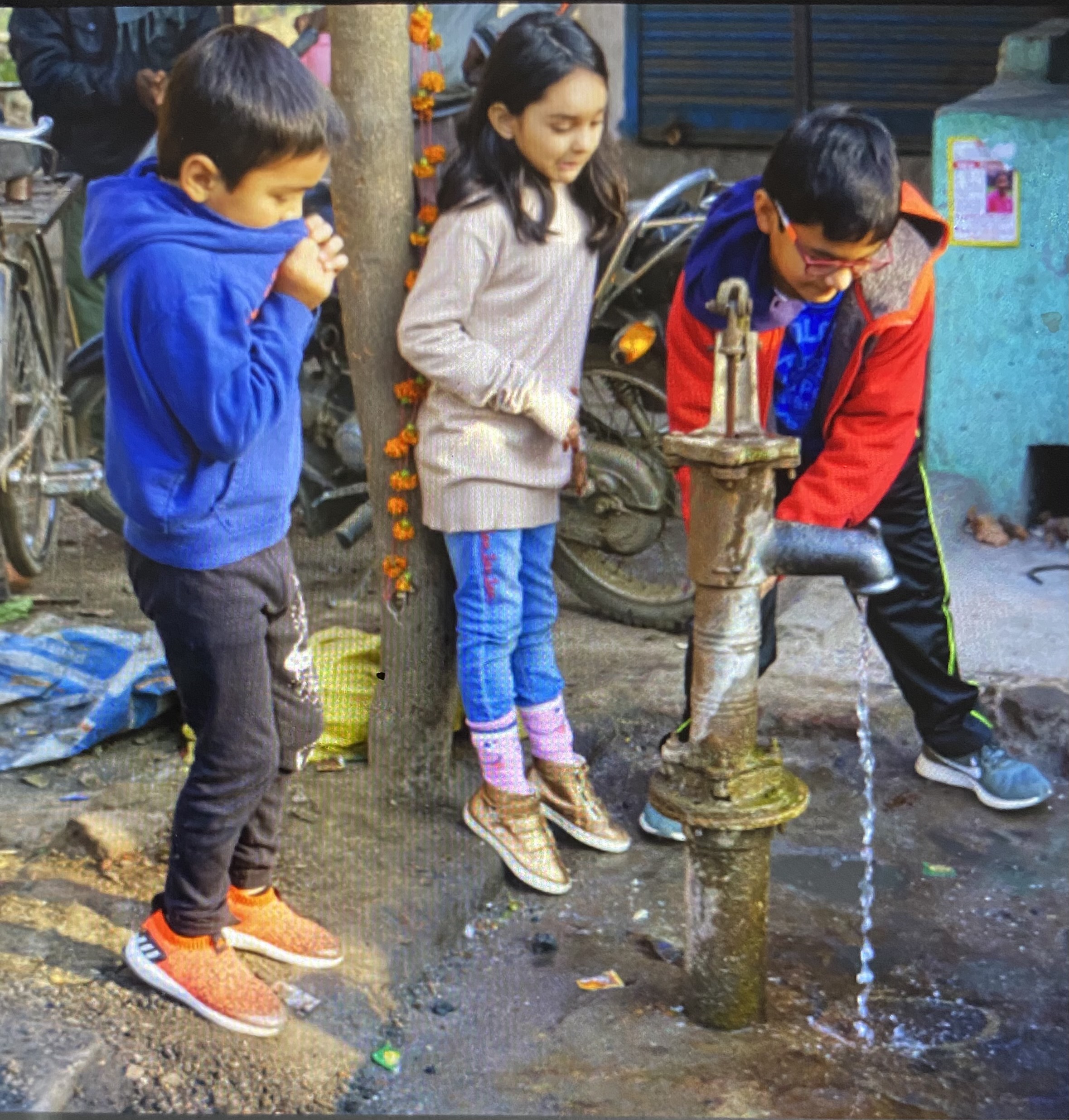 (Kazim struggling with the hand pump while Ayaan and Serena look on!)